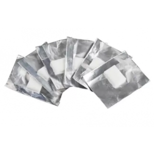 Bandes d'Aluminium pour Faux Ongles Acryliques, conçues pour faciliter la pose et l'entretien. Chaque boîte contient 100 bandes de 75 x 107 mm avec une éponge au centre. Imbibez l'éponge d'acétone ou autre dissolvant, enveloppez le doigt avec la bande en plaçant l'éponge imbibée sur le vernis à dissoudre. Laissez poser 10 minutes, puis nettoyez.