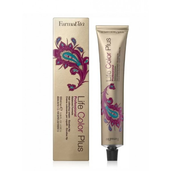 Coloration permanente Life Color Plus de Farmavita, large palette de nuances. Enrichi en extrait d'huile de graines de Tournesol, Life Color Plus apporte brillance intense, résistance et tenue de la couleur. La couverture des cheveux blancs est excellente (100%). Avec Life Color Plus c'est la fin des sensations de picotement et des odeurs désagréables.